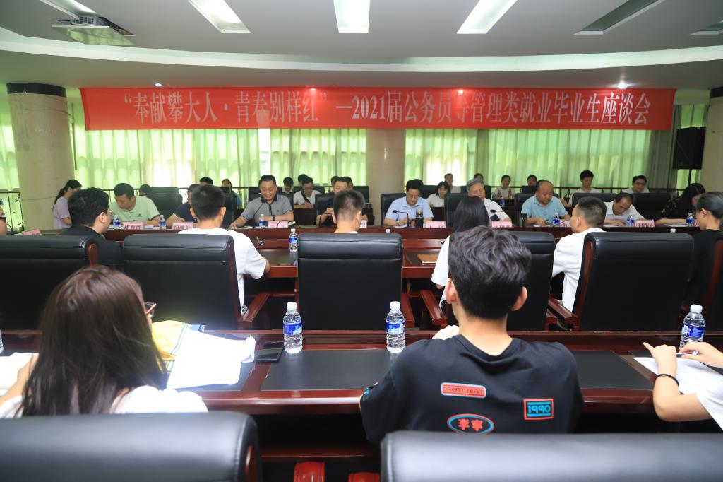 6月16日下午,“奉献攀大人·青春别样红”2021届公务员等管理类就业毕业生代表座谈会在办公楼四楼会议室举行,学校党委书记王斌,党委副书记、校长王曙光,党委副书记胥刚,学生工作部、教务处、招就处、团委、体育部负责人,文学院、法学院分管学生工作领导,以及公务员、选调生、三支一扶、西部计划志愿者、援疆计划等管理类就业的毕业生代表共计57名同学参加了本次座谈会。