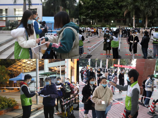 学校组织学生志愿者参加校内引导服务,体温测量、手部消毒,确保考试平稳顺利进行。