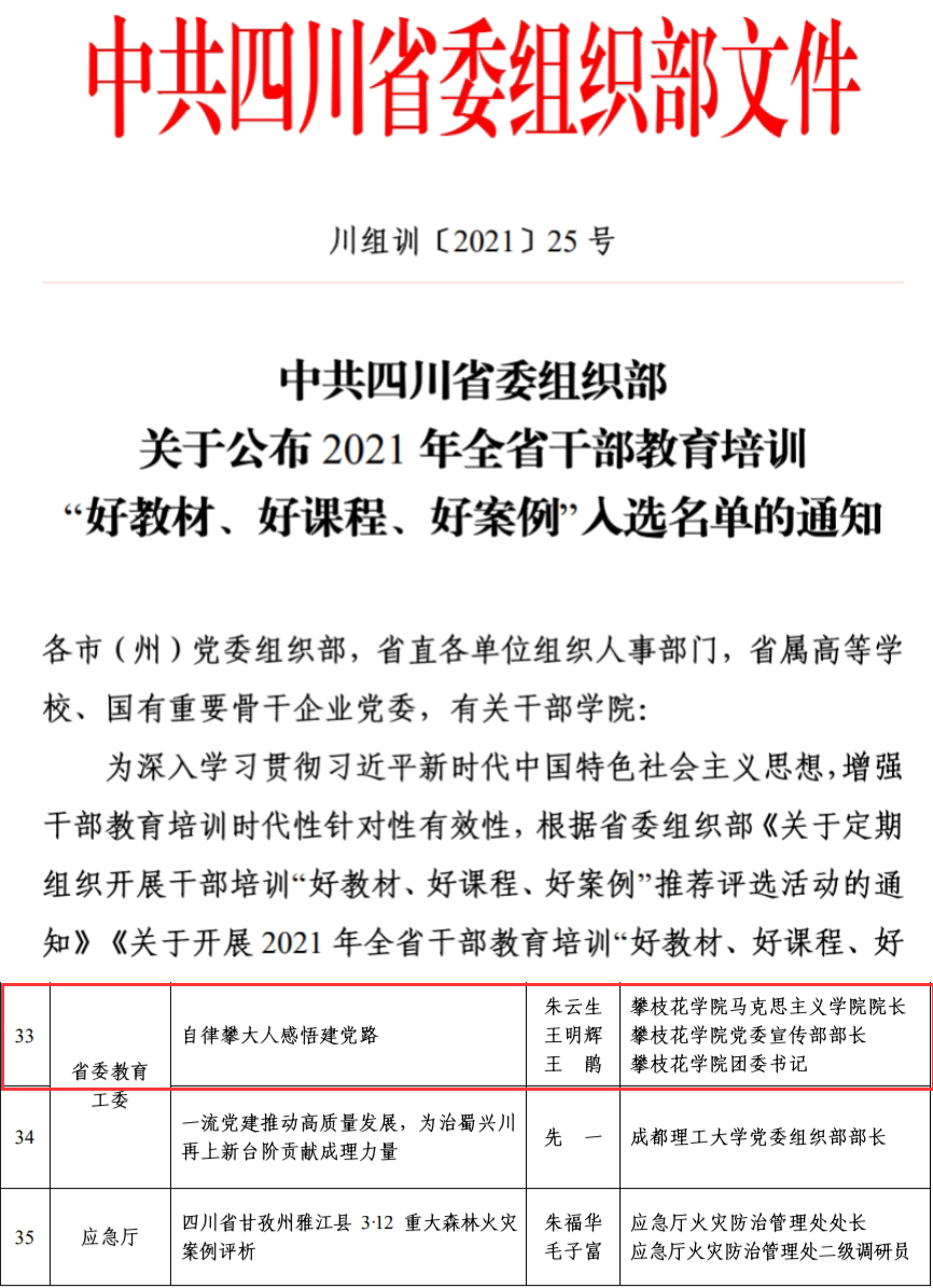 近日,中共四川省委组织部发布《关于公布2021年全省干部教育培训“好教材、好课程、好案例”入选名单的通知》,我校推荐作品《自律攀大人 感悟建党路》入选“好案例”名单。