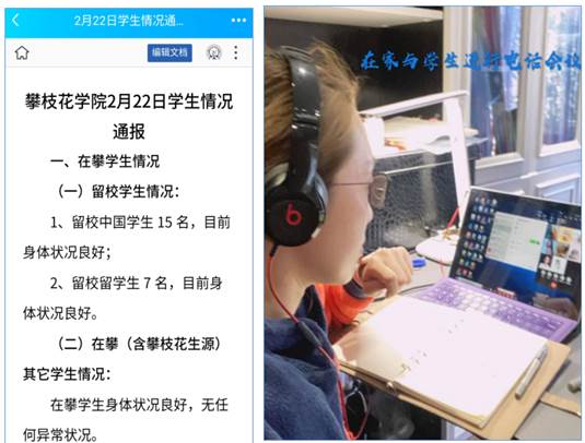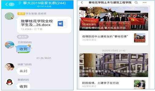 心系学生,不负使命。辅导员们针对学生的实际学习、生活、工作需求,通过多种途径做好学生的假期教育管理。比如外国语学院的何旋老师运用“辅导员云课堂”,开好云班会,做好学生思想教育工作;土建学院的陈智老师给予学生寒假生活温馨提示、学习指导、就业指导,鼓励学生主动参加网络主题教育活动,让学生进行在线课程学习,做到“停课不停学,学习不延期;艺术学院的罗钧梅、钒钛学院安昀、人文学院赵燕、土建学院的刘瑞峰老师等以身作则,承担社会责任,投身于志愿服务,引导学生积极面对疫情,传递爱的声音;发挥朋辈榜样力量,我校多名学生也在当地作为志愿者贡献力量,他们在抗疫行动之中践行青年的使命与担当,也让这个“加长版”的假期充满温暖。