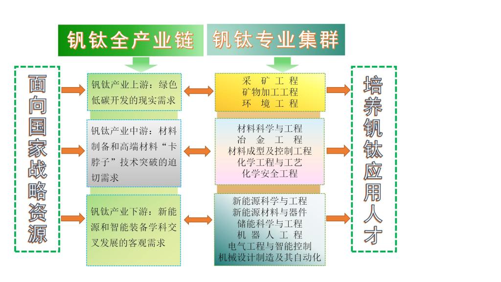 一是构建钒钛战略科教新高地,服务国家战略资源开发与钒钛产业升级举措更加明确,实现多学科交叉和资源整合。二是服务钒钛资源上游绿色开发需求特别是四川省委省政府重点推进的红格南钒钛磁铁矿开发利用项目,在采矿工程、矿物加工工程基础上,培育智能采矿,支撑国家绿色矿山智能化钒钛产业基地建设。三是突破中游材料高端化瓶颈,以国家一流专业材料科学与工程为核心,联动冶金工程、材料成型及控制工程专业,打造低碳冶金、高端钒钛原材料、资源循环等特色方向,破解钒钛材料“卡脖子难题。四是补齐下游新能源与智能装备延伸短,加快建设新能源科学与工程、储能科学与工程、新能源材料与器件专业,形成“钒钛新材料及智能装备”专业群,推动产业向能源动力、装备制造领域拓展。
