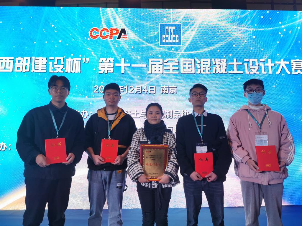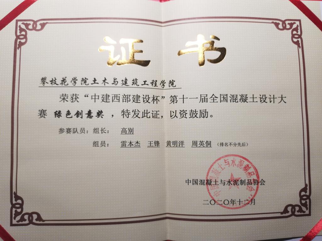 12月4日,“中建西部建设杯”第十一届全国混凝土设计大赛在南京举行。我校参赛队(土建学院学生:高别、雷本杰、王锋,钒钛学院学生:黄明洋、周英僮;指导教师:刘静)获得绿色创意奖。