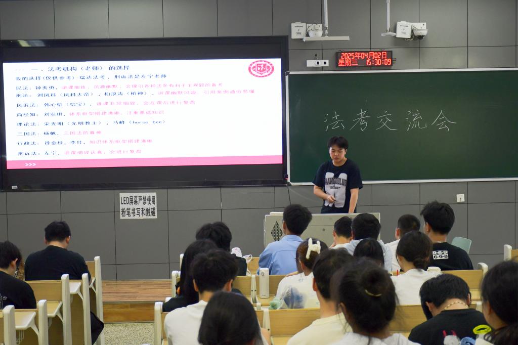 4月2日,法学院在1-101教室举办法律职业资格考试经验交流会,会议由学生科科长刘沙主持,2022级全体学生参加会议。本次交流会特邀21级通过法律职业资格考试的6名优秀学生代表分享备考经验,旨在为即将迎战法律职业资格考试的学子提供科学指导,搭建朋辈互助平台,缓解备考压力。